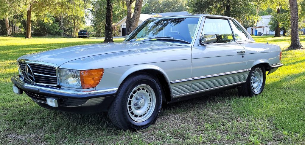 Heute wollte ich euch mal einen 380 SL vorstellen, der sein Leben in Deutschland begonnen hat und jetzt in Florida zum Verkauf steht. Wie man auf den Bildern ersehen kann, hat er die deutschen Scheinwerfer und auch die kleinen Stoßstangen, was ihn natürlich sehr attraktiv macht. Der Verkäufer hat den Wagen 1985 in Deutschland erworben und dann sofort in die USA eingeführt, was auch mit Belegen nachzuvollziehen ist. Sogar der Tacho ist noch deutsch und zeigt 89000 Kilometer an. Der SL ist ein Astral silbermetallic lackiert und hat schwarze Lederinnenausstattung mit den optionalen Kindersitzen hinten. Hervorzuheben ist auch noch, dass dieser M 116 V 8 Motor schon die Duplex Steuerkette hat und nicht die einfache Steuerkette wie sie um diese Zeit noch bei den amerikanischen Ausführungen dieses Motors verbaut wurde.