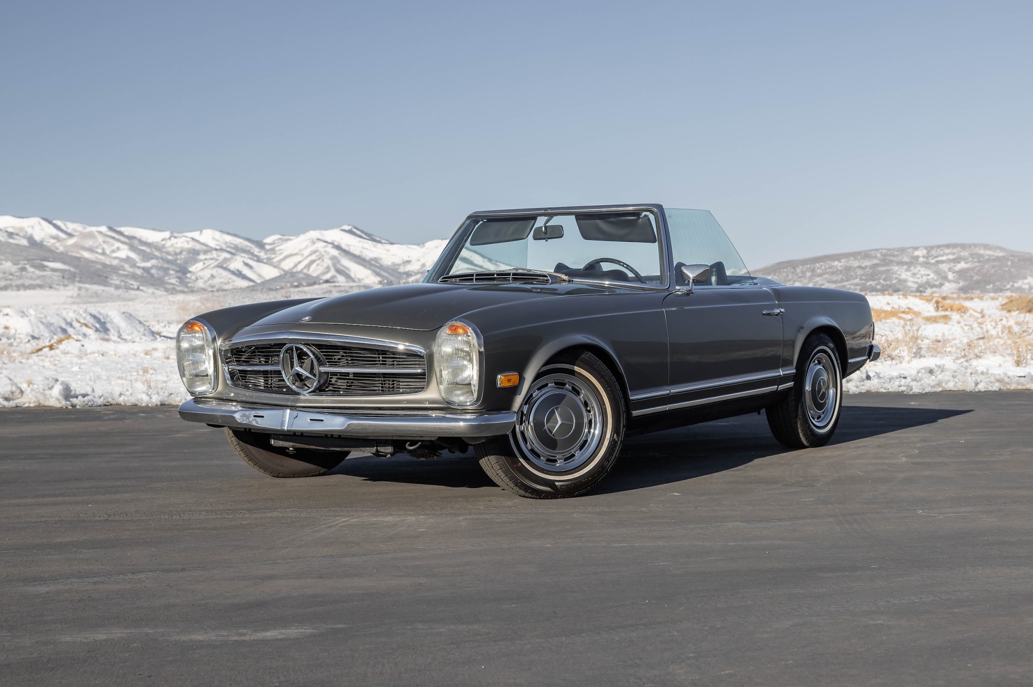 Dieser Mercedes-Benz 280SL aus dem Jahr 1968 ist in schönem anthrazitgrau Metallic lackiert und mit einer grauen MB-Tex Innenausstattung ausgestattet. Angetrieben wird er von einem 2,8-Liter-Reihenmotor, der mit einem Viergang-Automatikgetriebe gekoppelt ist. Zur Ausstattung gehören ein abnehmbares Hardtop in Wagenfarbe, ein schwarzes Verdeck, 14-Zoll Stahlräder mit Radkappen in Wagenfarbe, eine Servolenkung, vier Scheibenbremsen mit Servounterstützung, eine Klimaanlage und eine Becker Mexico AM/FM/Kassetten-Stereoanlage, das nicht original ist. Eine Restaurierung soll um 1990 in Kalifornien durchgeführt worden sein, und der Wagen verbrachte laut Verkäufer zufolge einige Zeit in Japan, bevor er im Januar 2016 vom Verkäufer erworben wurde. Die Einspritzpumpe wurde anschließend erneuert, und zur Vorbereitung des Verkaufs wurden ein Ölwechsel, ein Austausch des Luftfilters, der Zündkerzen und die Dichtung der Getriebeölwanne. Dieser 280SL wird jetzt mit einer Betriebsanleitung, Werkzeug, einem Ersatzblinkerschalter, einem Hardtop-Ständer, einer maßgeschneiderten Autoabdeckung und einem sauberen Titel aus Utah auf den Namen des Verkäufers angeboten. Der Wagen wird auf bringatrailer.com im Auktionsformat angeboten.